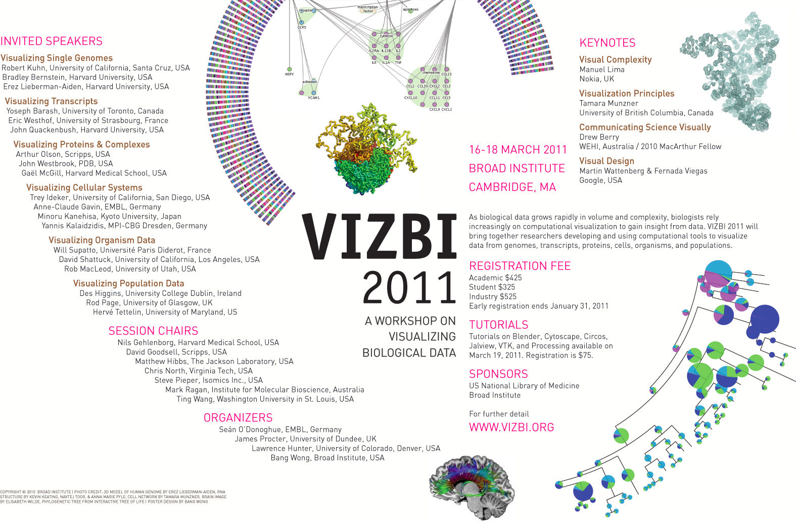 VIZBI 2011 was held March 16-18 at the Broad Institute, Cambridge MA, USA. The conference reviewed the state-of-the-art and challenges in visualizing data from genomes, transcripts, proteins, cells, organisms, and populations.