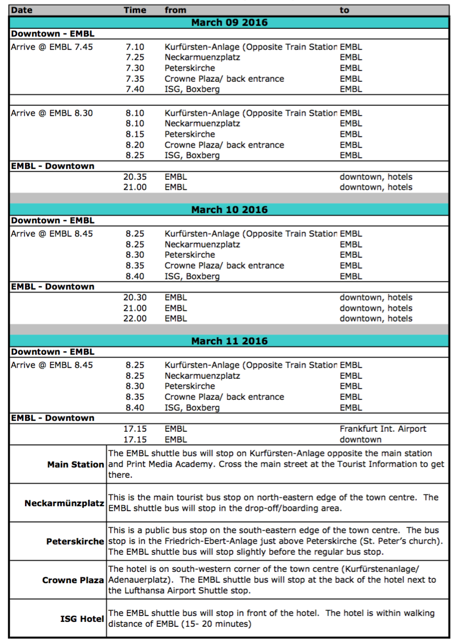 A free conference shuttle buses service will be provided for VIZBI 2016 participants. The buses will go from designated stops near the hotels to EMBL and back, mornings and evenings.